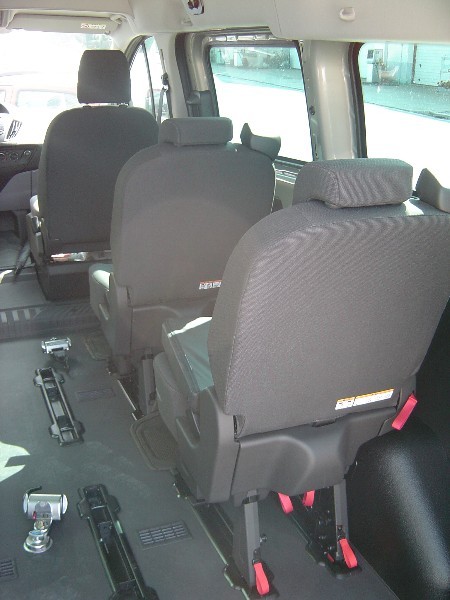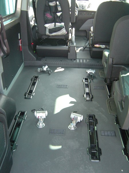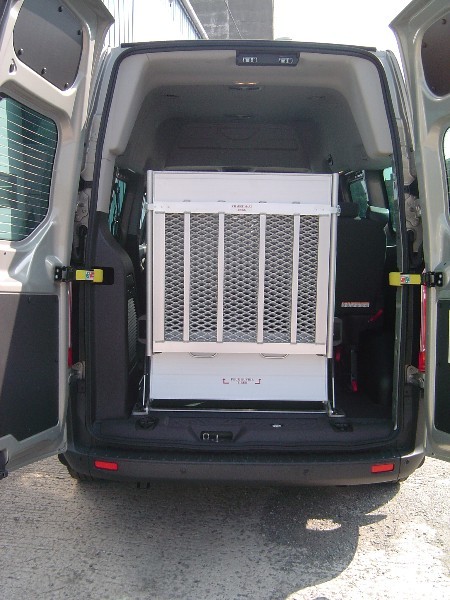Nous avons équiper sur ce Ford Transit, une rampe et les accroches pour le transport d’une personne en fauteuil roulant électrique.