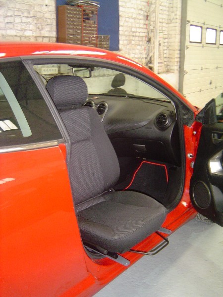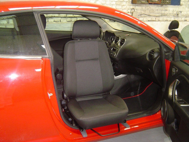 Le siège « turnout » permet de pivoter le siège dans le véhicule pour faciliter le transfert de la personne dans le véhicule. Il existe un modèle manuel ou électrique. Celui que nous avons installé dans cette Alfa Romeo Mito est manuel.